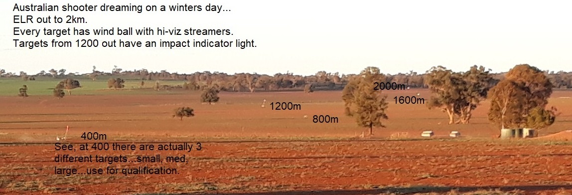 Firing Position? This is another thing governed by the facility... The Ko2M and all the like require the shooter to be prone off a bipod. Prone is great when on manicured land. But here in Australia, we suffer from several things like drought, dust, meat ants, fire regulations and total fire bans, hills, limited places to shoot, anti-gun and anit-shooters (2 different groups, but we won't get into that here) and fox/dingo fences, etc. Let's face it, for the majority of the population, we can't all just drive 5 min down the road and start shooting extreme distances just anywhere we like.